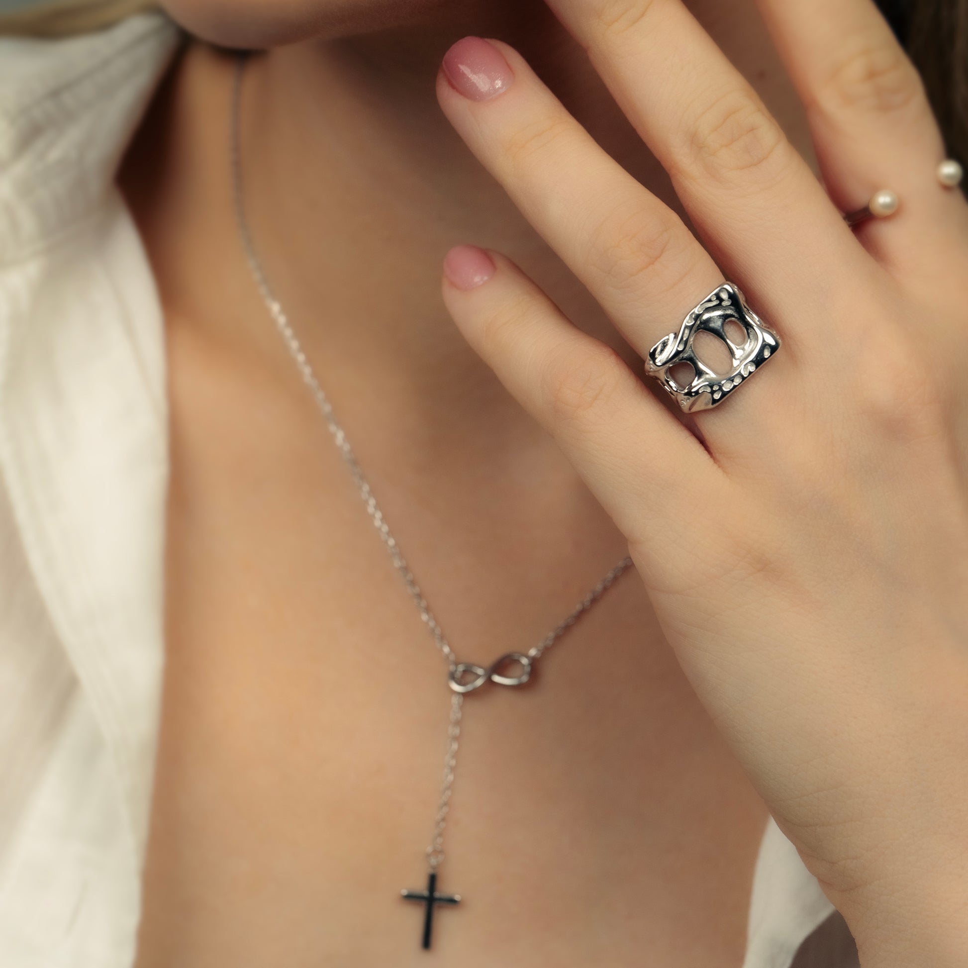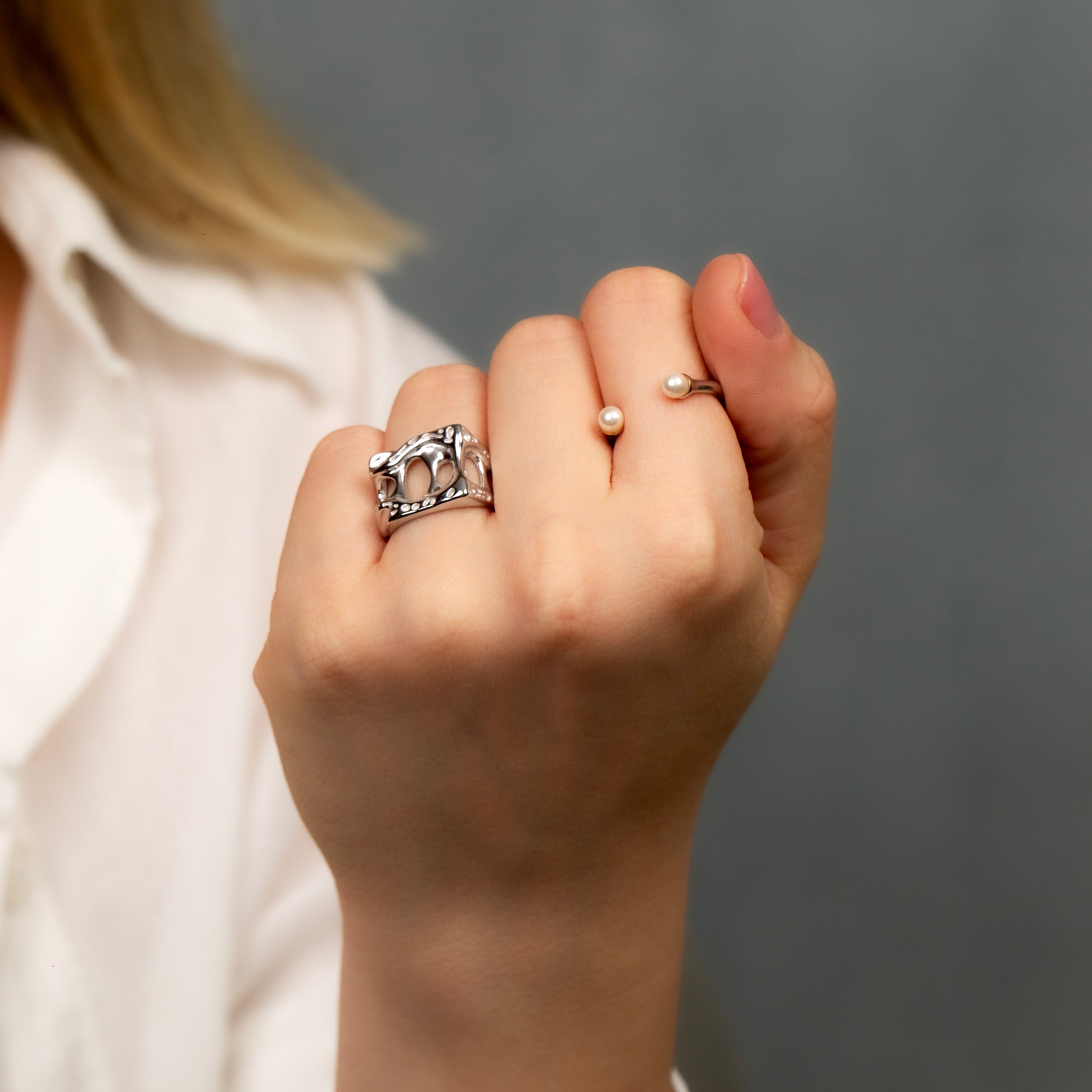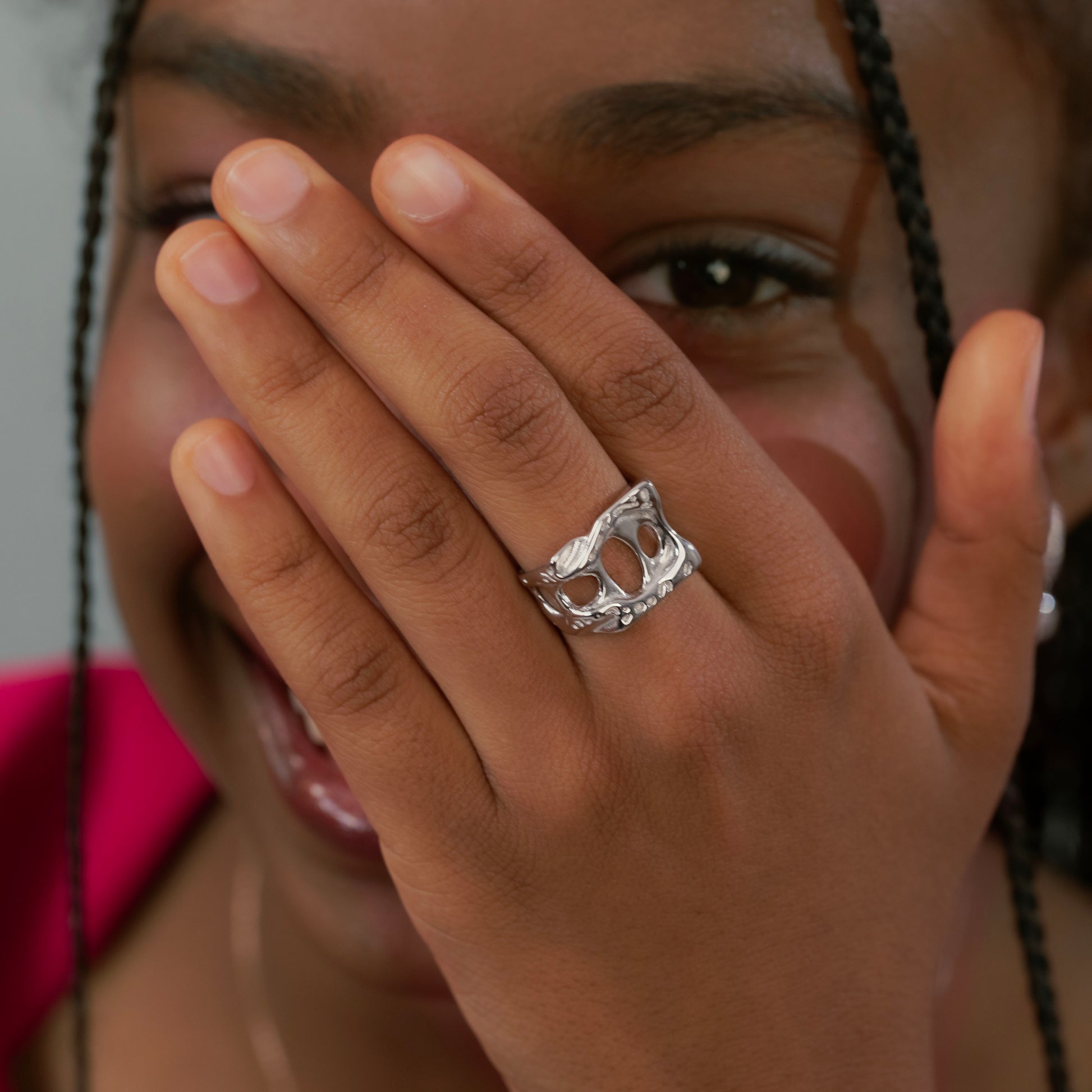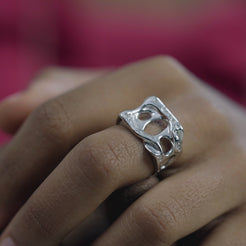 A sculptural form shaped by movement and void. Fontana redefines silver through bold cut-outs and fluid curves — a statement ring with artistic depth and modern edge.